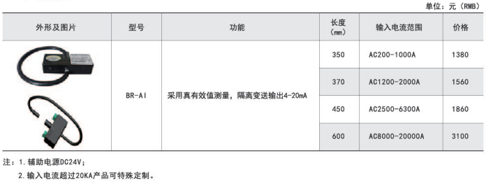 BR-AI | 采用真有效值測量, 隔離變送輸出4-20mA | 350 | AC200-1000A |
