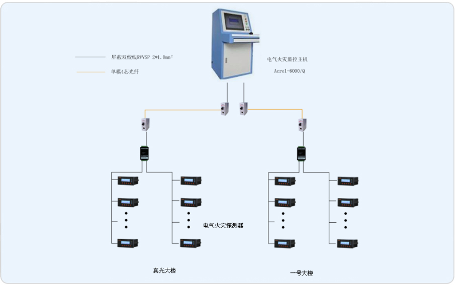 本期工程的監(jiān)控范圍主要為真光廣學(xué)大樓及新建一號樓,新建一號樓47個漏電流監(jiān)控裝置分布在B1~8F中,真光大樓33個漏電流監(jiān)控裝置分布在B1F~9F中,現(xiàn)為本項(xiàng)目設(shè)計(jì)一套Acrel-6000電氣火災(zāi)監(jiān)控系統(tǒng),監(jiān)控裝置通過集線器及光纖至電氣火災(zāi)監(jiān)控裝置,并由此來實(shí)時監(jiān)測商業(yè)樓內(nèi)重要回路的漏電流,以確保商業(yè)區(qū)配電系統(tǒng)的電氣安全。