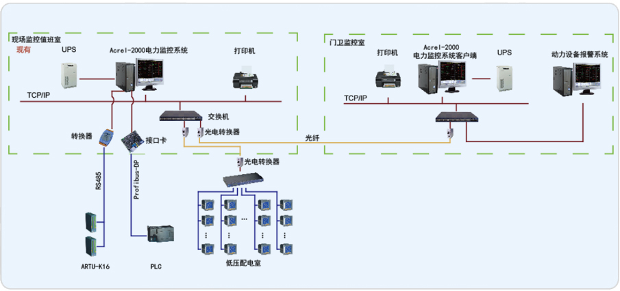 飛浦電子技術(shù)(上海)有限公司動(dòng)力房設(shè)備報(bào)警系統(tǒng),是在現(xiàn)有報(bào)警系統(tǒng)的基礎(chǔ)上進(jìn)行的智能化改造項(xiàng)目。原有系統(tǒng)基于西門子PLC采集現(xiàn)場各種傳感器變位或報(bào)警信號,再通過聲、光形式輸出報(bào)警信號。為了便于管理和維護(hù),將動(dòng)力房設(shè)備報(bào)警系統(tǒng)PLC數(shù)據(jù)以及部分未接入PLC的報(bào)警開關(guān)量通過安科瑞ARTU裝置采集至現(xiàn)有的安科瑞Acrel-2000電力監(jiān)控系統(tǒng);在門衛(wèi)監(jiān)控室增加兩臺(tái)監(jiān)控計(jì)算機(jī),一臺(tái)作為安科瑞Acrel-2000電力監(jiān)控系統(tǒng)客戶端,另一臺(tái)整合了動(dòng)力房設(shè)備報(bào)警系統(tǒng)遠(yuǎn)程訪問客戶端;原監(jiān)控值班室和門衛(wèi)值班室之間通過光纖組建局域網(wǎng),實(shí)現(xiàn)系統(tǒng)遠(yuǎn)程監(jiān)控。
