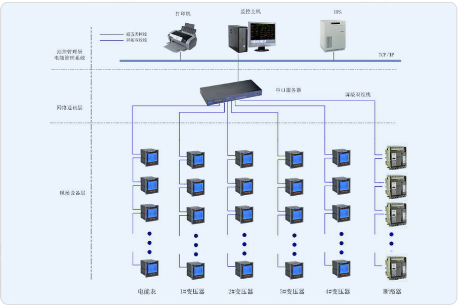安科瑞電氣股份有限公司于2014年承接該項目電力監(jiān)控系統(tǒng),系統(tǒng)通過多功能的電力監(jiān)控裝置、通訊網絡和計算機軟件,實現(xiàn)工廠內供配電系統(tǒng)在運行過程中的數(shù)據采集、運行監(jiān)視、事故預警、事故記錄和分析、電能質量檢測、三相不平衡監(jiān)視、繼電保護等,完成工廠的安全供電、用電管理、設備管理和運行管理。系統(tǒng)由主控層、通訊管理層和現(xiàn)場控制層構成。系統(tǒng)要求盡量減少集中采集數(shù)據的裝置以保證系統(tǒng)的通訊可靠性。本次項目主要涉及當陽市蒙牛乳業(yè)有限責任公司配電室內的網絡多功能儀表、電能表以及斷路器,53個回路需要監(jiān)測,監(jiān)控主機位于配電室。