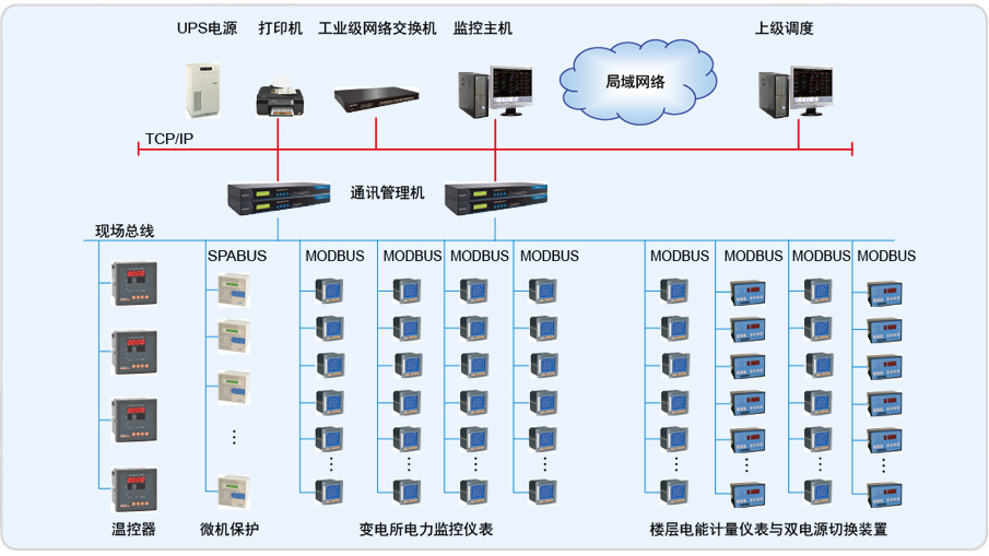 整個系統(tǒng)采用網(wǎng)絡(luò)分布式結(jié)構(gòu),監(jiān)控主機位于地下一層變電所值班室內(nèi),各變電所配電柜內(nèi)安裝有本公司ACR230ELH、ACR220EFLK儀表共計200多回 路。系統(tǒng)采用開放的通訊協(xié)議,通過現(xiàn)場總線與高低壓配電系統(tǒng)、變壓器溫控裝置、發(fā)電機的智能接口、ATSE及EPS等相連,實現(xiàn)數(shù)據(jù)通訊功能。同時監(jiān)視系統(tǒng)提供標準的RS485接口向上連接到BMS系統(tǒng)。